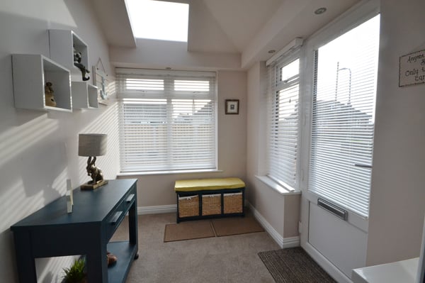 Created as part of a front extension, a Part double glazed PVC door leads into the generous porch which offers plenty of light from twin rooflights, plus double glazed windows to front and side, both with blinds. Part double glazed PVC door with window beside into hall