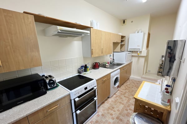 Fitted in a range of base and wall mounted units with work surfaces, electric cooker with extractor, single drainer sink unit with tiled splashback, space for washing machine, wall mounted boiler, space for drop-leaf table