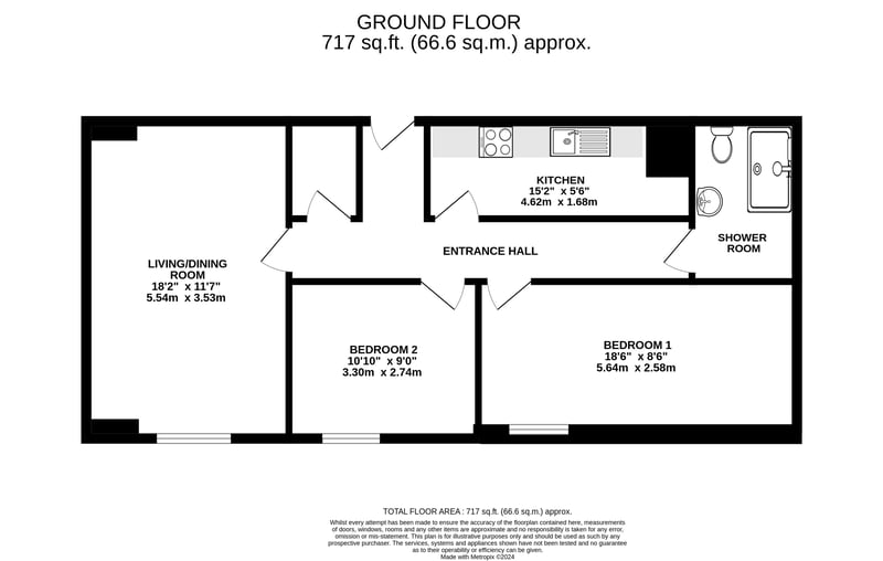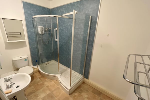 Fitted with walk-in shower enclosure and electric shower unit, hand wash basin and low level WC. Radiator, extractor fan