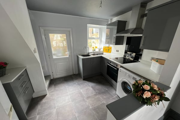 Double glazed window to rear, part double glazed door to rear, modern range of base and wall mounted units with work surfaces, single drainer sink unit, electric hob with oven and extractor, fitted washing machine and fridge freezer, stairs to first floor, tile effect flooring
