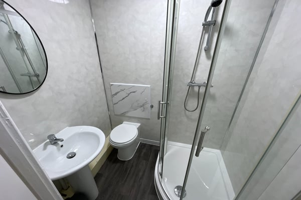 Quadrant shower enclosure with thermostatic shower unit, pedestal hand wash basin, low level WC. Extractor fan, PVC wall cladding, wood style flooring