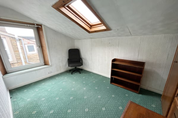 A second floor room of generous proportions with vaulted ceiling, two sets of eaves cupboards, two Velux windows