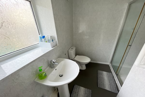 Double glazed window to rear, shower enclosure with shower unit, pedestal hand wash basin, low level WC. PVC cladding to wall areas