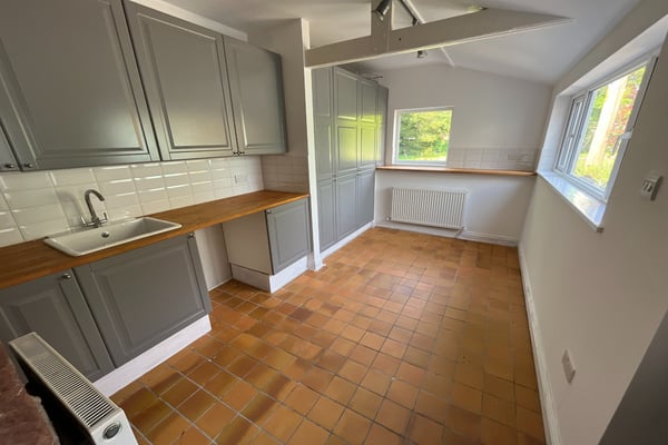 A lovely room with vaulted style ceiling, exposed beams and an exposed stone feature wall, double glazed windows to side and rear, two double radiators, built in cupboards to one wall, sink unit with wooden drainer, space for washing machine, tiled flooring, part double glazed door into garden
