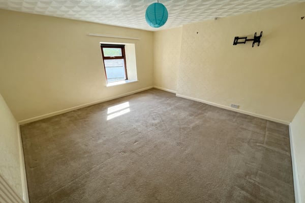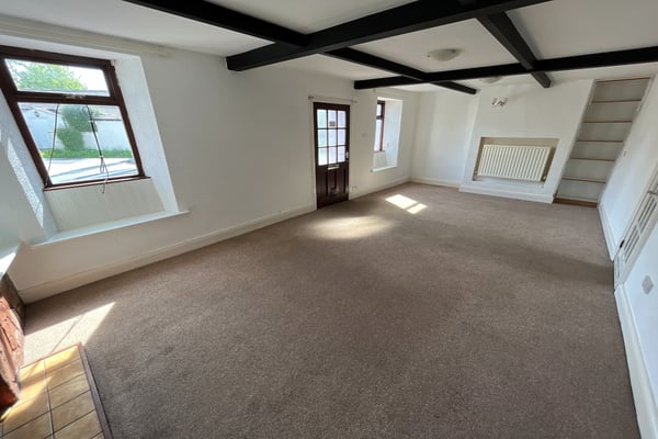A generous room running the full width of the house with two windows to front, double radiator, multi fuel stove with stone surround, exposed ceiling beams, part glazed door into hall.