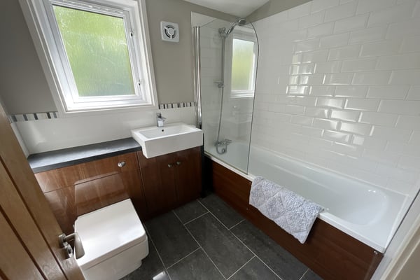 Double glazed window to front, panel bath with shower attachment and screen, hand wash basin with cupboards under, hidden cistern WC. Tiled walls and flooring, extractor fan, chrome towel rail