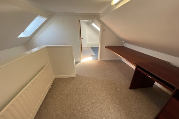 A generous landing area with built in study desk and storage units, doors to bedrooms, radiator, Velux window to side.