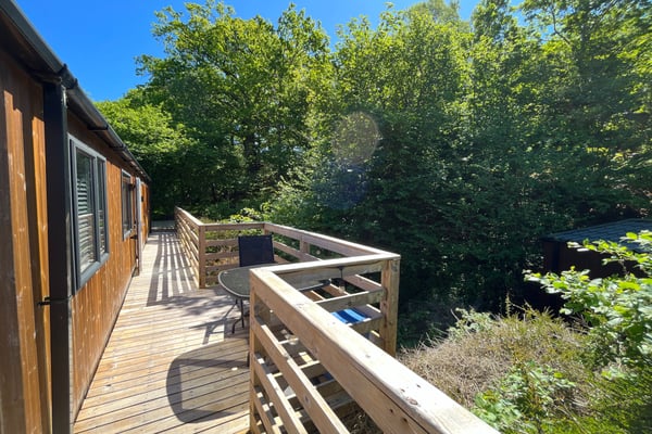 To the front of the property is an inset parking area for two cars with steps leading up from here onto a wrap-around decking area with separate areas to front and side for dining and access to front door. Siting for LPG gas bottles. To the rear there is a generous twin level decking area with dividing wall and set overlooking a small stream. This provides space for patio sofa set and for sun loungers.