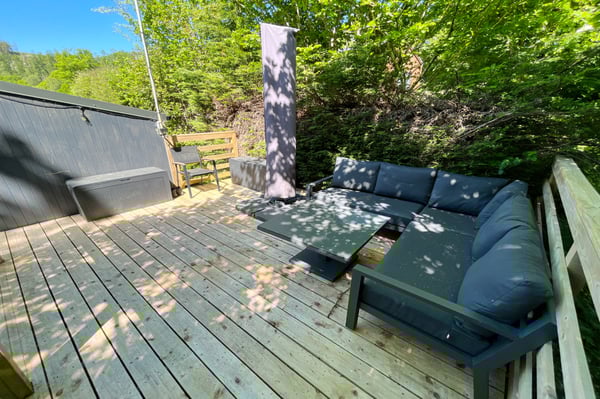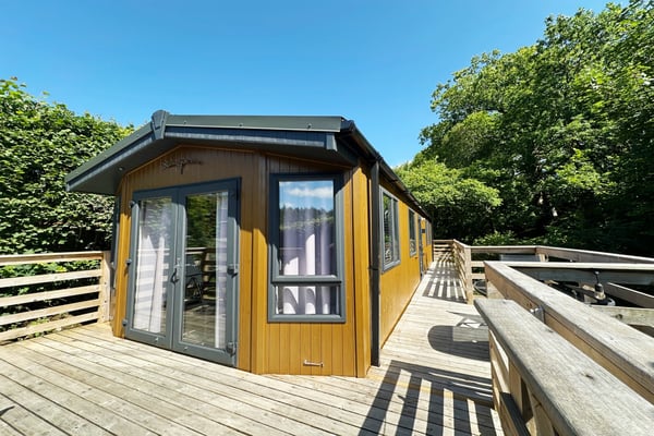 To the front of the property is an inset parking area for two cars with steps leading up from here onto a wrap-around decking area with separate areas to front and side for dining and access to front door. Siting for LPG gas bottles. To the rear there is a generous twin level decking area with dividing wall and set overlooking a small stream. This provides space for patio sofa set and for sun loungers.