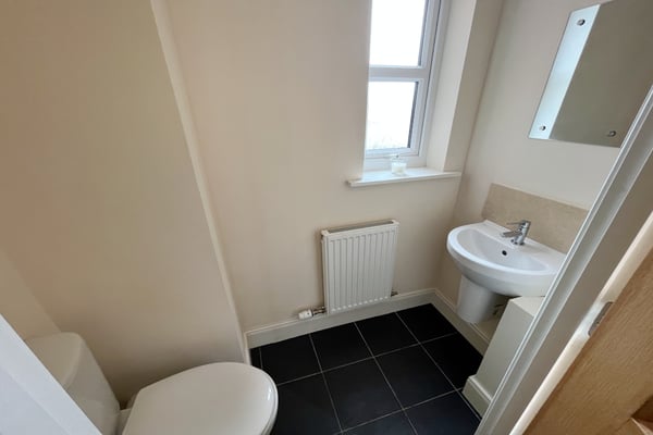 Double glazed window to side, low level WC. Wall mounted wash hand basin, double radiator, extractor fan