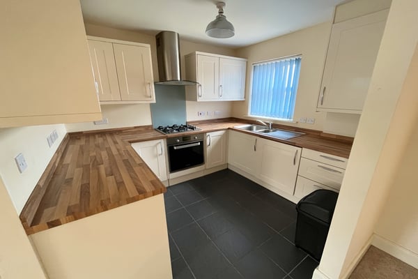 Fitted in a modern range of base and wall mounted units with work surfaces, single drainer sink unit, gas hob with oven and extractor, double glazed window to front, cupboard housing combi boiler, integrated fridge, freezer and washing machine, tiled flooring