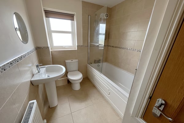 Double glazed window to front, panel bath with electric shower unit and screen, pedestal hand wash basin, low level WC. Extractor fan, double radiator, tiled splash areas, tiled flooring, built in cupboard over stairs