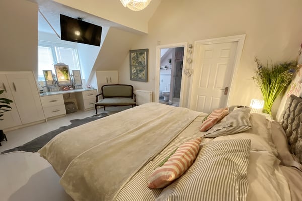 Dormer double glazed window to front, two eaves cupboards, double radiator, wood style flooring, doors to en-suite and a dressing room