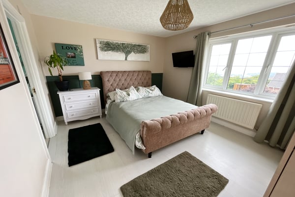 A generous landing with double glazed window to side, access to loft space, built in airing cupboard, doors to rooms, wood effect flooring