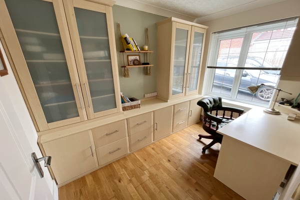 Double glazed window to side, fitted storage units and desk, radiator, coved ceiling, wood style flooring