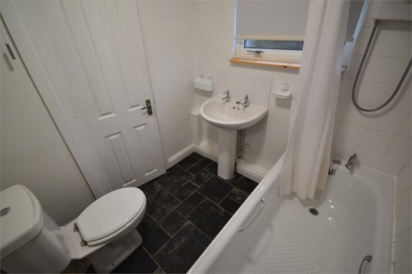 Double glazed patterned window to side, panelled bath with electric shower over, pedestal hand wash basin, low level WC, radiator, tiling.