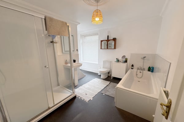 A generous bathroom with panel bath and shower attachment, double shower enclosure with thermostatic shower unit, pedestal hand wash basin, low level WC. double glazed window to rear, double radiator, coved ceiling, ceiling rose.