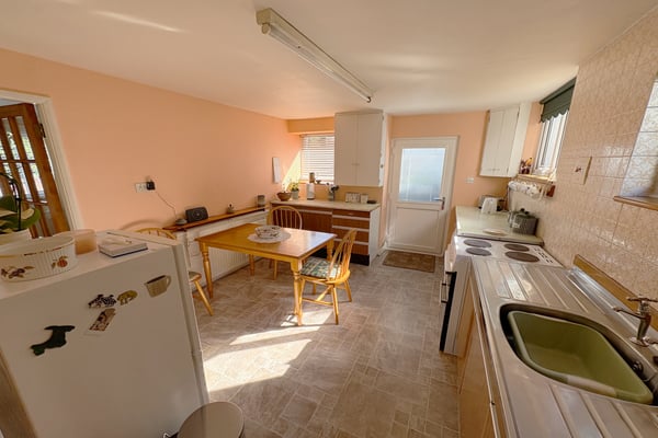A generous room fitted in a range of base and wall mounted units with work surfaces, double drainer sink unit, space for electric cooker, double glazed window to side and two to rear, part double glazed door to rear onto drive, space for table and chairs, double radiator, space for washing machine, tumble dryer, dishwasher and fridge freezer, doors to living room and shower