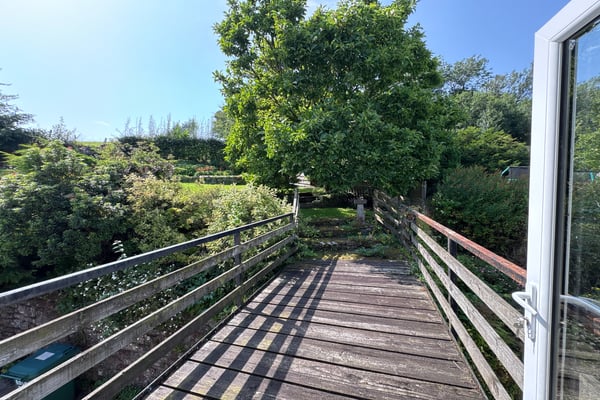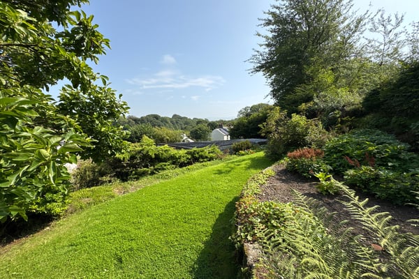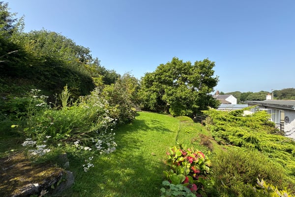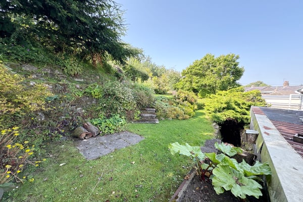 To the side of the property is a concrete hardstanding for parking located between the house and the garage with access door into property and a gated path with steps leading up to garden. The garden is also accessed via a walkway from the first floor living/dining room. The gardens are tiered and mature in nature being mainly laid to lawn with various flower beds, shrubs and bushes.