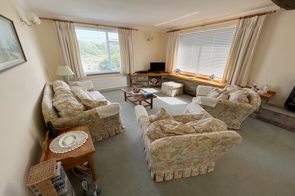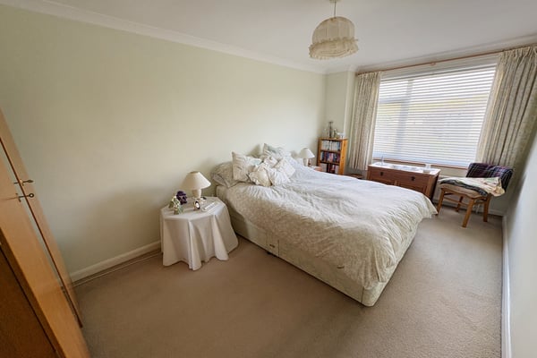 A generous triple aspect room with double glazed windows to front and side, two radiators, double glazed French doors onto access bridge to rear garden, gas fire on raised plinth, coved ceiling, space for table and chairs