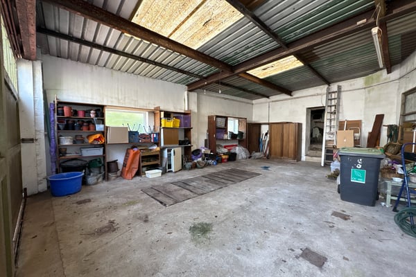 To the side of the property there is a large garage building with sliding entry doors that will accommodate four vehicles with ease. It includes an inspection pit for car maintenance, power and light, window to side and steps that lead up to a workshop with its own exit door to rear. Perfect for vehicle based hobbies, wood turning or pottery hobbies.