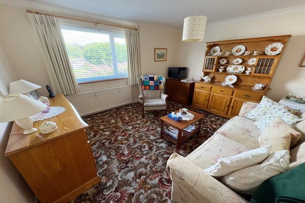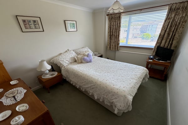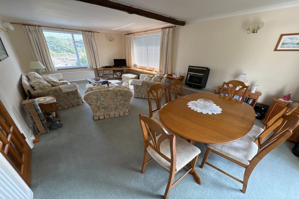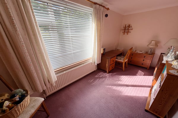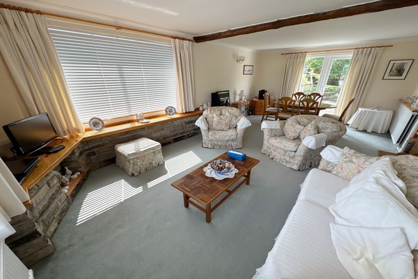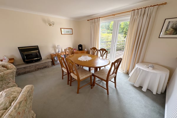 A generous triple aspect room with double glazed windows to front and side, two radiators, double glazed French doors onto access bridge to rear garden, gas fire on raised plinth, coved ceiling, space for table and chairs