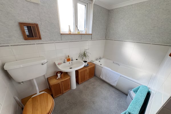 Double glazed window to rear, panel bath, pedestal hand wash basin, low level WC. Double radiator, coved ceiling, tiling to half wall height, extractor fan