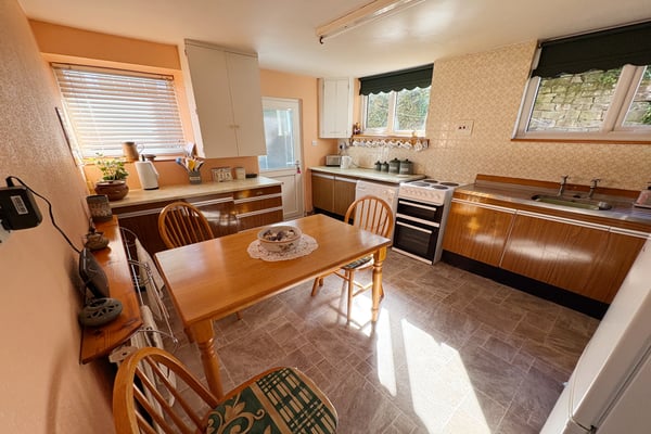 A generous room fitted in a range of base and wall mounted units with work surfaces, double drainer sink unit, space for electric cooker, double glazed window to side and two to rear, part double glazed door to rear onto drive, space for table and chairs, double radiator, space for washing machine, tumble dryer, dishwasher and fridge freezer, doors to living room and shower