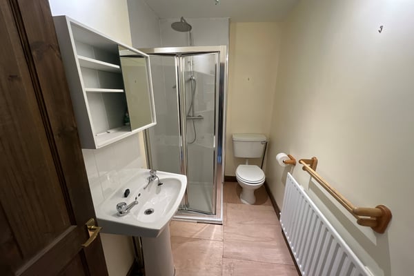 fitted with shower enclosure and unit, pedestal hand wash basin, low level WC, towel rail and extractor fan, splash areas.