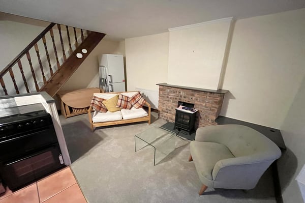 A double aspect open plan room cleverly using the available space. Double glazed windows to front and side, brick fireplace with TV plinth, electric stove effect fire, stairs to first floor, radiator.