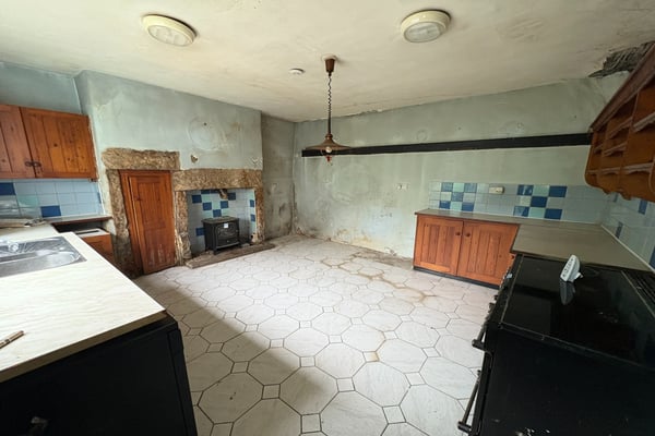 A generous room with fitted cupboards and worktops, sink unit, space for cooker and other appliances, chimney breast feature, window to side, door into a rear enclosed porch with door to courtyard garden