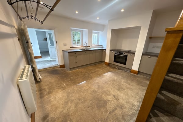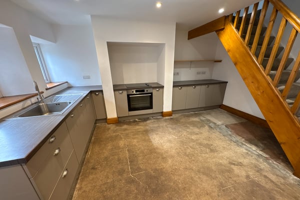 Two double glazed windows to rear, fitted modern range of base units with work surfaces, electric hob with oven, single drainer sink unit, fridge and freezer, electric radiator, stairs to first floor, space for table and chairs, flagstone flooring, door to utility