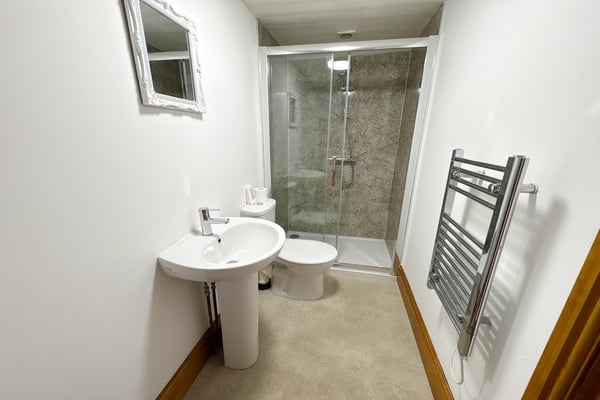 A handy first floor shower room with personal doors from each bedroom creating an en-suite feel to both bedrooms. Double width shower enclosure with thermostatic shower unit, pedestal hand wash basin, low level WC. Electric towel rail, extractor fan.