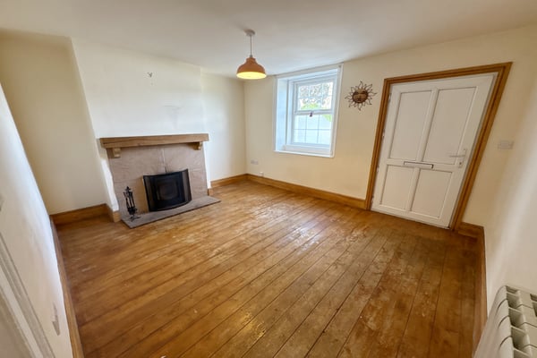 Steps lead up from the roadside to a PVC front door which leads into living room. Double glazed window to front, multi fuel stove recessed in chimney breast, wooden floorboards, electric radiator, door into kitchen