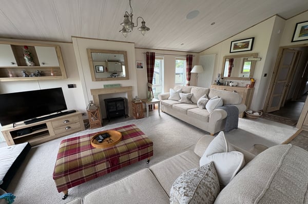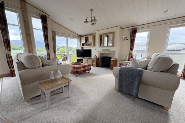 The property sits in a nice position within the park overlooking a green at the front with a view to Skiddaw. There is a two vehicle tarmac parking area at the side and steps lead up to a wrap-around veranda with composite deck and enclosed by glass panels. Steps lead down form the veranda to a rear patio terrace which overlooks a green with trees and makes a perfect place to eat and enjoy the afternoon sun.
