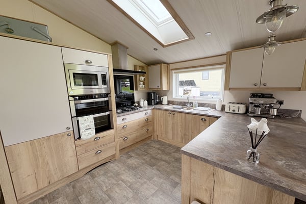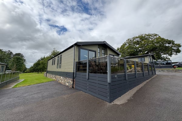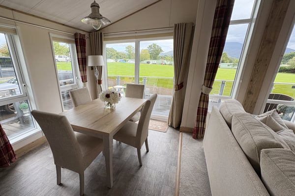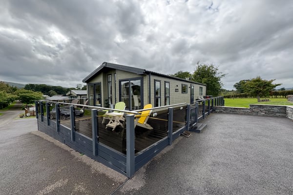 The property sits in a nice position within the park overlooking a green at the front with a view to Skiddaw. There is a two vehicle tarmac parking area at the side and steps lead up to a wrap-around veranda with composite deck and enclosed by glass panels. Steps lead down form the veranda to a rear patio terrace which overlooks a green with trees and makes a perfect place to eat and enjoy the afternoon sun.