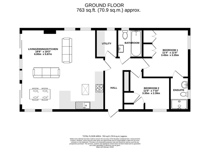 A double glazed entry door leads into an L-shaped hall with bench and coat hooks, double radiator, doors to rooms, cupboard housing LPG combi boiler