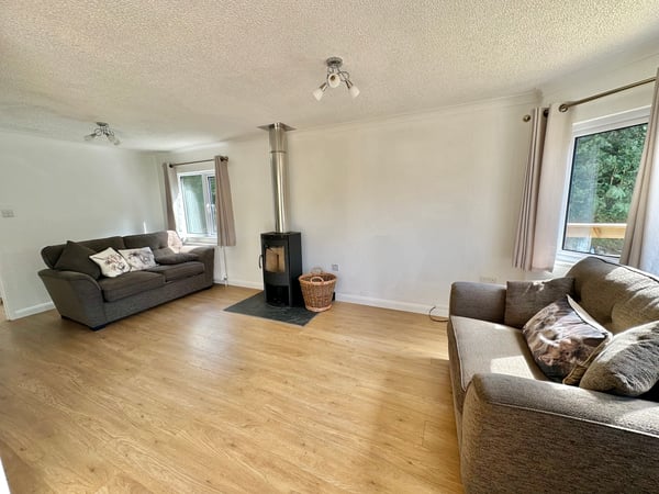 A double aspect room with double glazed windows to front and side, two double radiators, contemporary style multi fuel stove on slate style hearth, coved ceiling, wood style flooring, door to kitchen and opening into dining room