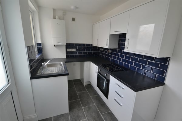 Recently installed stylish range of base and wall mounted units with complimenting work surfaces, single drainer sink unit with tiled splashbacks, electric hob with extractor over and oven under, wall mounted combi boiler. Space for fridge freezer and washing machine, tiled flooring, radiator, double glazed window to side, double glazed door to side.