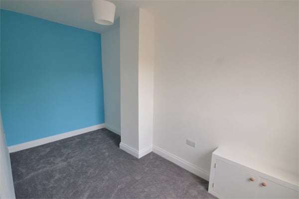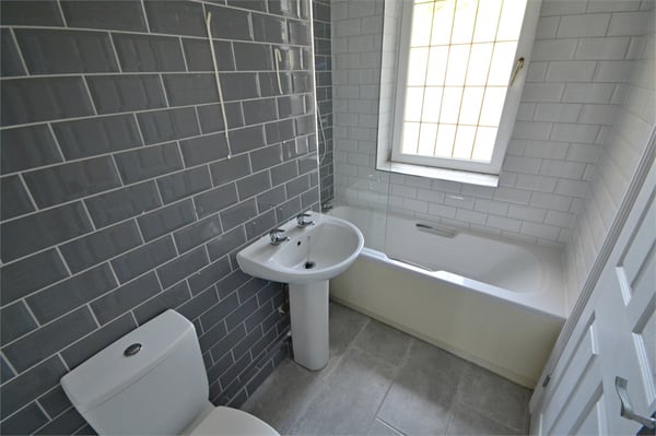 Newly fitted suite including a panel bath with thermostatic shower and screen, pedestal hand wash basin and low level WC. Tiled walls and flooring, extractor fan, heated towel rail, double glazed window to rear.